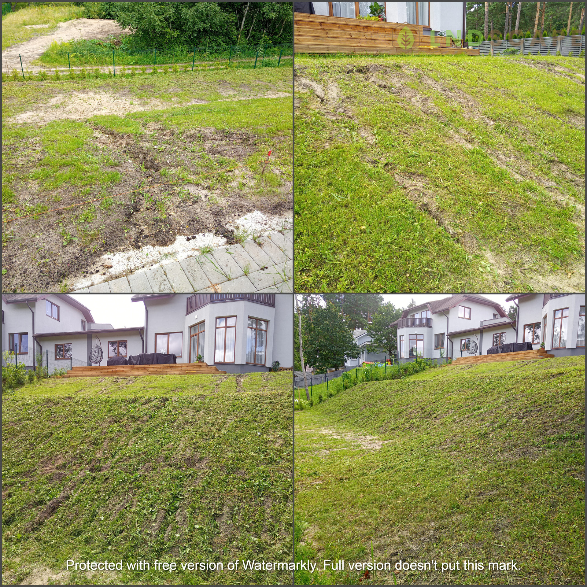 Pirms paklāja ieklāšanas virsmu sagatavojām atbilstoši ražotāja rekomendācijām, t.i., atjaunojām augsnes kārtu, nolīdzinājām to, iesējām nepieciešamo daudzumu mauriņa sēklas “Apzaļumotājs” no zāliena sēklu ražotāja Krastmaļi sēklas un virsmu noplanējām (sablietējām ar speciālu veltni). Pēc tam uz virsmas uzklājām dabīgo salmu/kokosa ģeopaklāju, nostiprinājām to ar enkurāķiem, kas pasargā to no noslīdēšanas un nostiprinājām ģeopaklāja galus enkurgrāvjos.